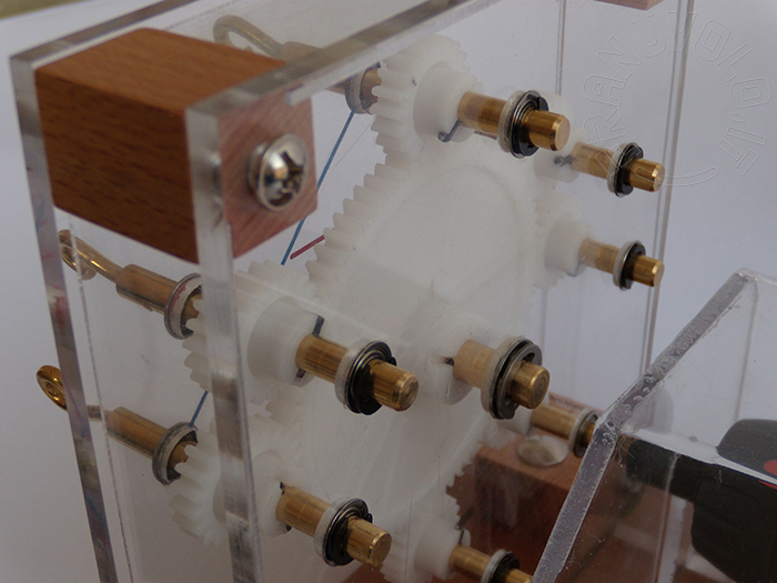 Quattro blocchetti di legno fanno da distanziatori, due di essi, gli inferiori, più lunghi, fanno anche da elementi di unione tra il pacco ingranaggi e la tavoletta di base. I blocchetti sono scanalati onde poter alloggiare le parti di chiusura perimetrali.